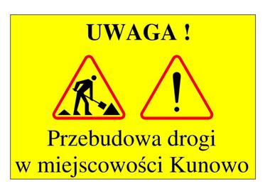 Na zdjęciach: tablica z ostrzeżeniem o utrudnieniach w ruchu oraz widok ogólny drogi w Kunowie przed rozpoczęciem prac budowlanych.