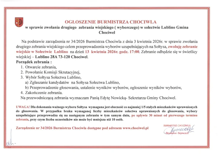 Burmistrz Chociwla uruchomił procedurę wyborczą zarządzeniem nr 34/2026 z 3 kwietnia i wyznaczył zebranie wiejskie sołectwa Lublino na 13 kwietnia 2026 r. o godzinie 17:00. Spotkanie odbędzie się w świetlicy wiejskiej w Lublinie 28A.