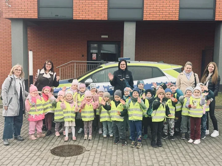 Po części edukacyjnej przyszedł czas na zwiedzanie komendy. Przedszkolaki zobaczyły, jak wygląda praca policjantów od środka, a dużą atrakcją okazały się radiowozy, które od razu przyciągnęły ich uwagę. Dzieci aktywnie odpowiadały na pytania i chętnie dzieliły się własnymi spostrzeżeniami, co tylko potwierdziło, że taka forma nauki trafia do nich znacznie mocniej niż suche ostrzeżenia.